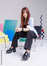 Fashion photo young confident brunette woman model Asian beautiful female wearing striped blue shirt and black pants posing looking at camera and sitting on chair in studio colorful background.