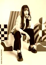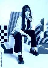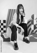 Fashion photo young confident brunette woman model Asian beautiful female wearing striped blue shirt and black pants posing looking at camera, sitting on white box posing in studio colorful background