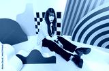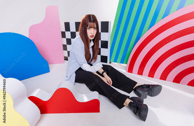 Fashion photo young confident brunette woman model Asian beautiful female wearing striped blue shirt and black pants posing looking at camera, sitting posing in studio colorful background.