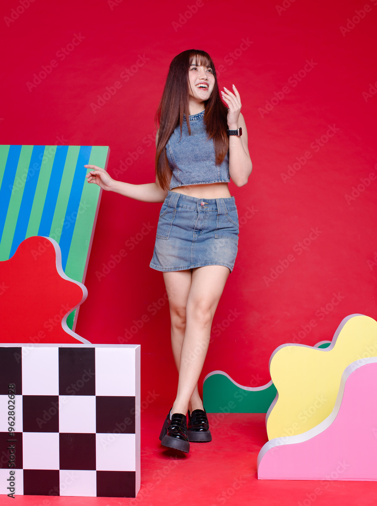 Fashionable photo concept stylish portrait young confident woman model Asian beautiful female wearing trendy denim sleeveless short top and jeans mini skirt, posing in studio on a colorful background.