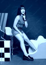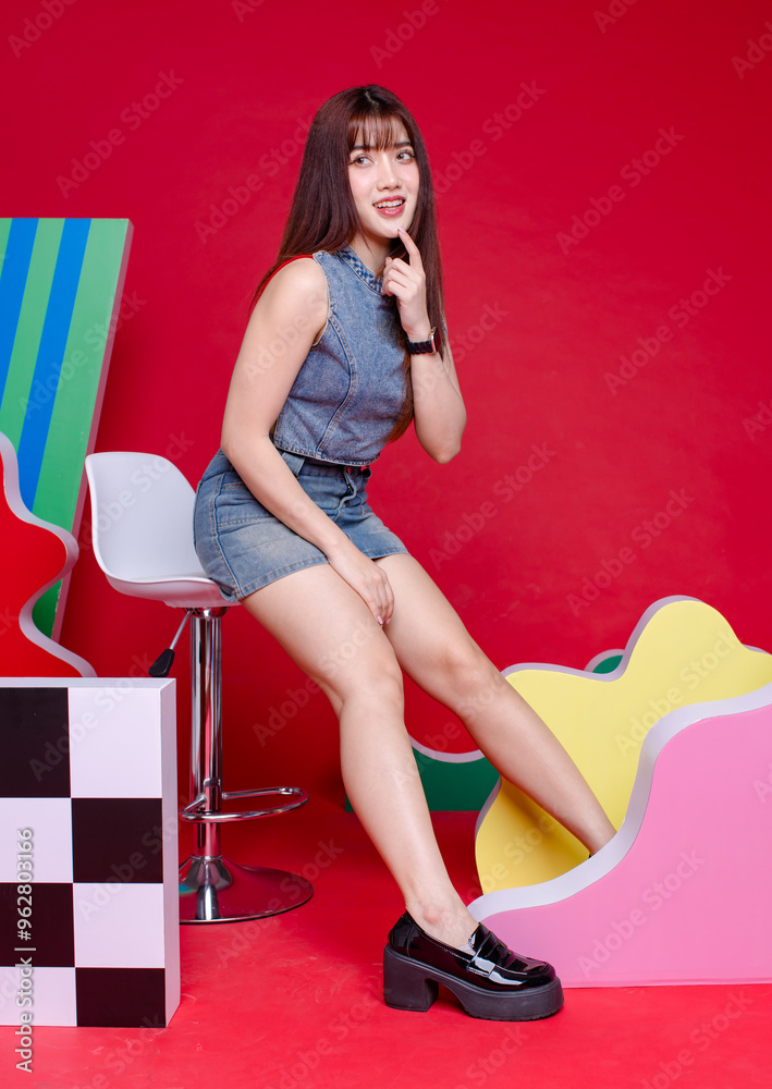 Fashion photo young confident woman Asian model beautiful female wearing trendy denim sleeveless short top and jeans mini skirt posing looking at camera, sitting on tall stool on colorful background.