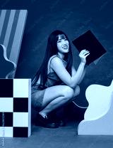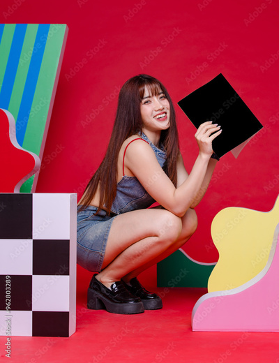 Fashionable photo concept confident woman model Asian beautiful female wearing trendy denim sleeveless short top, jeans mini skirt, sitting holding magazine posing in studio on a colorful background.