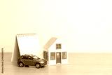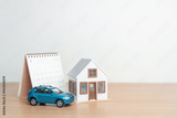 real, finance, wealth, investment, architecture, estate, insurance, leasing, contract, mortgage. The house is on a calendar, which is also on table. Concept of planning and organization, as the car