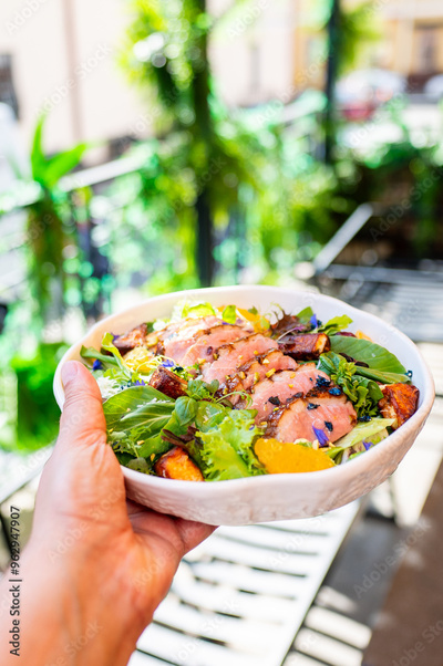 hand holding bowl of fresh salad with green leaves, grilled chicken, and colorful vegetables, set against a blurred outdoor seating area background. Perfect for healthy eating and lifestyle concepts.