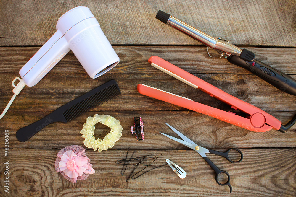 Hair accessories: hair dryer, curling iron, hair iron, comb, scissors, hair clips on the old wooden background. Toned image