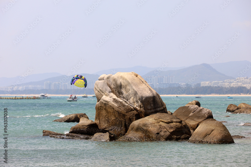 View to tropical beach with big stones in the Edge of the World park (Tianya Haijiao) on Hainan island