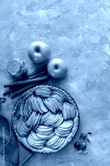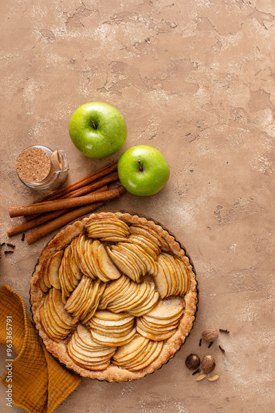 Apple pie or tart filled with sliced apples arranged on a pie base