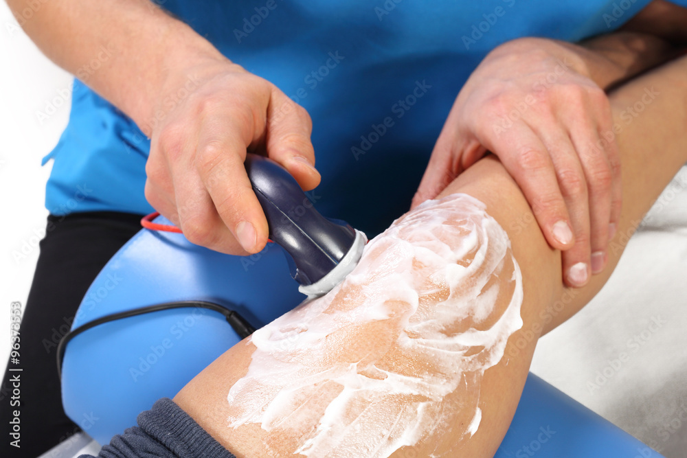 Rehabilitacja, ultradźwięki.Lekarz rehabilitant wykonuje zabieg na nodze pacjenta