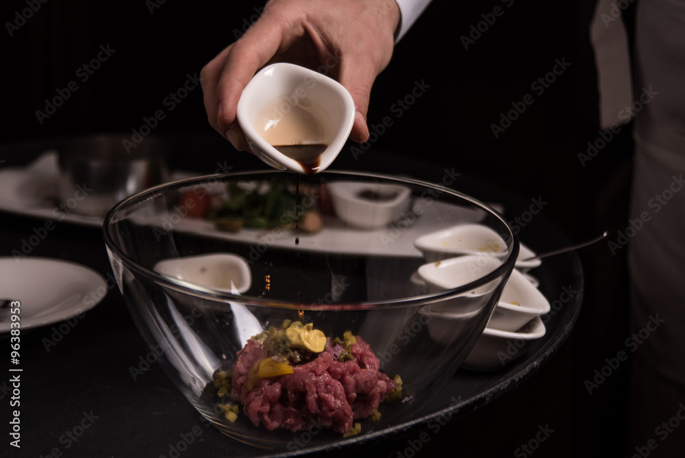 Chef prepares a delicious tartare, all the ingredients on the table next to