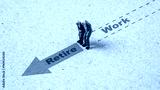 Miniature figure couple Senior Pensioners standing with work and retirement wording.