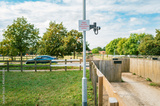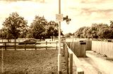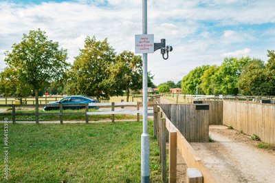 Shallow focus of a horse rider level crossing button seen within the famous horse racing town of Newmarket, Suffolk. The rider or jockey presses the button and waits for traffic to stop.