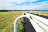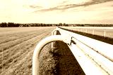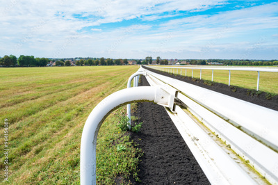 Dramatic view of a race horse plastic barrier seen looking down from Warren Hill to the famous horse racing town of Newmarket, Suffolk, UK.