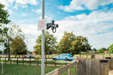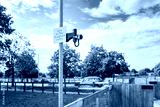 Shallow focus of a horse rider level crossing button seen within the famous horse racing town of Newmarket, Suffolk. The rider or jockey presses the button and waits for traffic to stop.
