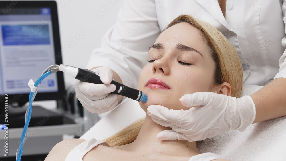 A cosmetologist performs hydropeeling, deeply cleansing and rejuvenating the client's skin in a modern clinic. Perfect for showcasing advanced beauty treatments and glowing skin results.