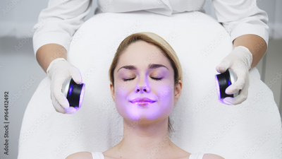 A woman undergoes LED light therapy, a non-invasive facial treatment to rejuvenate and enhance skin texture. Perfect for showcasing advanced skincare solutions for a youthful glow.