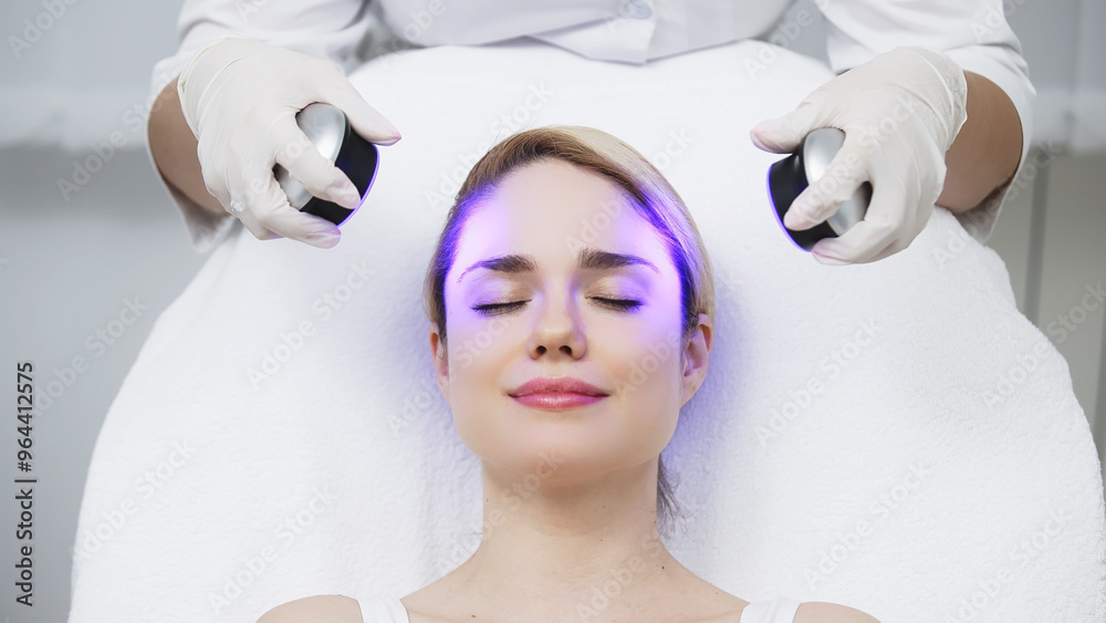 A cosmetologist performs LED light therapy for facial rejuvenation. This non-invasive treatment improves skin elasticity, reduces aging signs, and enhances overall skin radiance.
