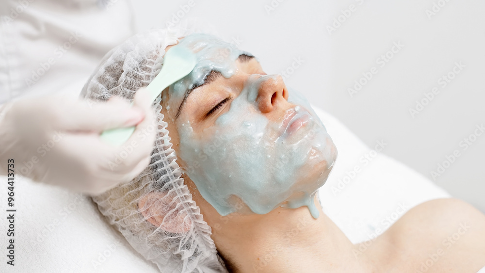 A woman in a cosmetology clinic with an alginate face mask on a light background. This mask boosts hydration and rejuvenation, ideal for promoting high-quality skincare treatments.