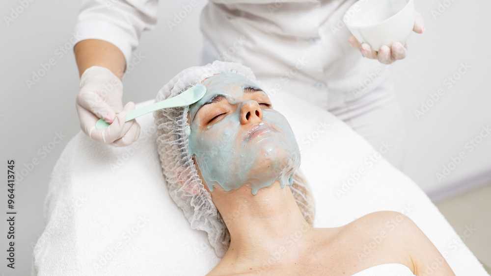 A woman in a cosmetology clinic with an alginate face mask on a light background. This mask boosts hydration and rejuvenation, ideal for promoting high-quality skincare treatments.