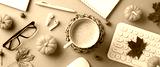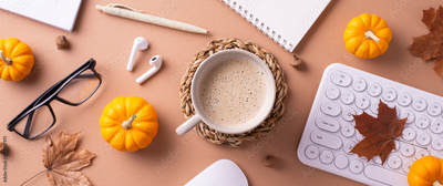 A cozy autumn-themed workspace featuring a coffee cup, mini pumpkins, and office supplies creating a warm atmosphere