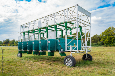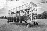 Training horse racing turnstile showing the individual horse and jockey compartments. Used to prepare the rider and horse for flat racing starts.