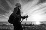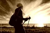 Portrait of beautiful woman wearing dark sportswear, light cap and sunglasses practicing Nordic walking by water in autumn weather. Side view. Nordic walker against backdrop of setting sun.