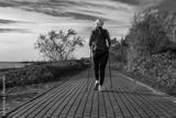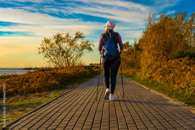 Woman wearing dark sportswear and light cap practicing Nordic walking on sidewalk by water in autumn weather during sunset. Active and healthy weekend. Back view