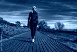 Beautiful blonde woman wearing dark sportswear, light cap and sunglasses walking on sidewalk in autumn weather. Active and healthy weekend.