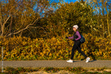 Beautiful blonde woman wearing dark sportswear and light cap practicing Nordic walking on sidewalk in autumn scenery. Active and healthy weekend.