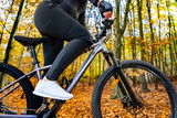 Woman wearing black sporty jacket, black cycling pants riding bicycle in forest in autumn scenery. Side view. Close-up for legs and buttocks.