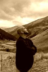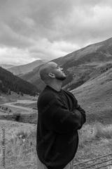 A thoughtful bald man, arms crossed, gazes up at the sky with his head held high against the backdrop of the stunning Carpathian Mountains.