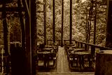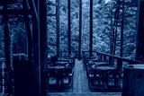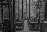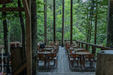 An outdoor dining area on a wooden deck surrounded by tall trees in a serene forest. String lights hang above, adding a cozy and peaceful atmosphere to the natural setting.