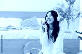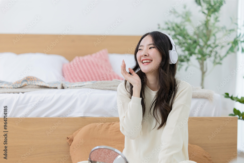 Asian woman listening music trough her wireless headphones in her bedroom