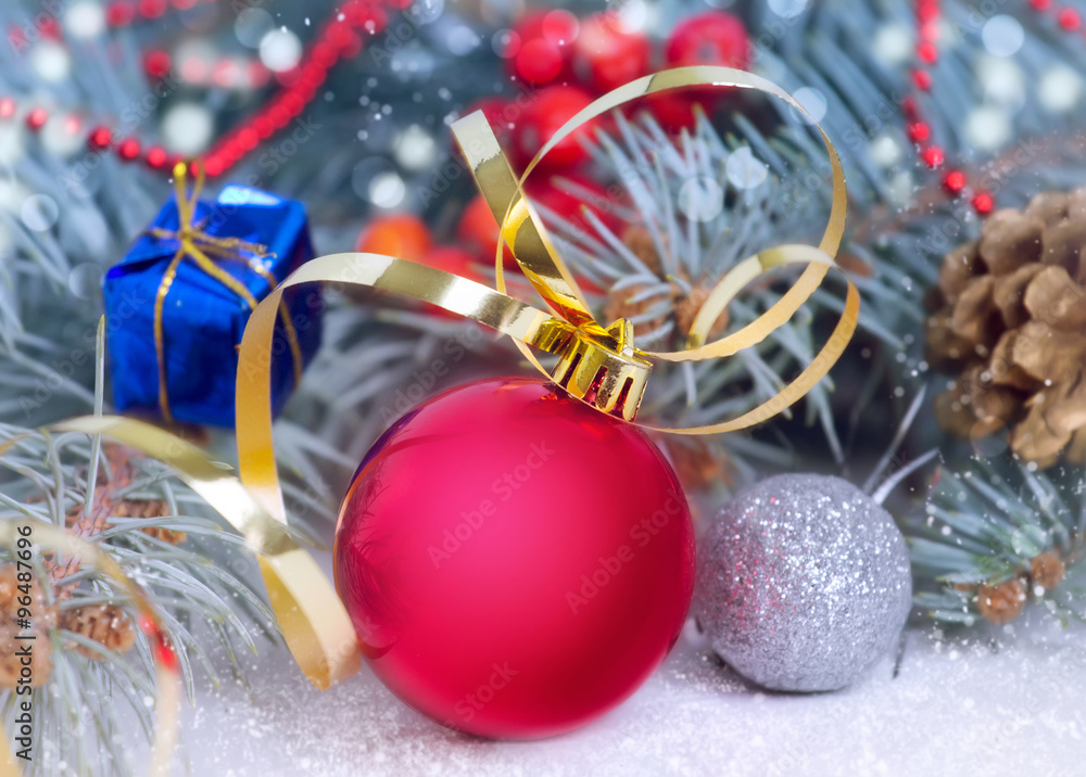 Сhristmas decorations closeup. Holiday baubles on fir.Red xmas ball.