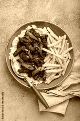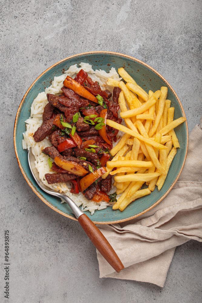 Delicious Peruvian dish lomo saltado made of beef tenderloin with french fries, rice, red onion, and tomatoes is served on a plate