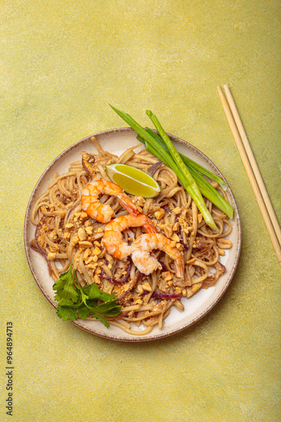 Bowl of pad thai noodles garnished with shrimps, lime, peanuts and chives, accompanied by chopsticks on a green background. Thai cuisine