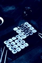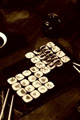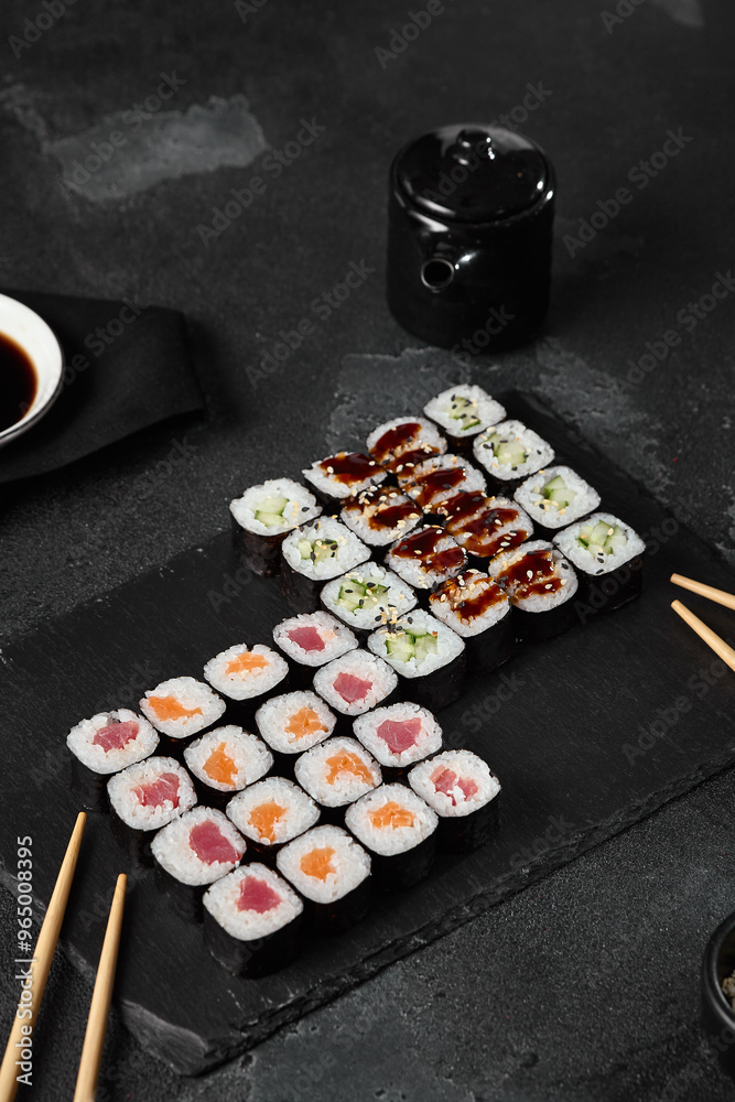 Elegant Hosomaki Sushi Set on Black Slate with Soy Sauce and Chopsticks