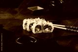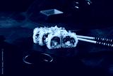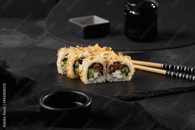 Gourmet Bonito Sushi Roll with Tuna Flakes and Teriyaki Salmon on Black Slate - Dark and Moody Style