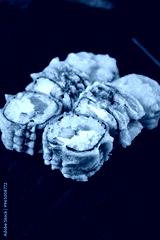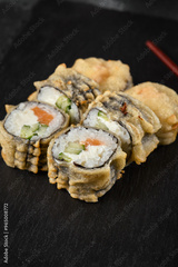 Crispy Tempura Shrimp and Avocado Roll with Spicy Sauce on Dark Slate Surface - Close-Up Food Photography