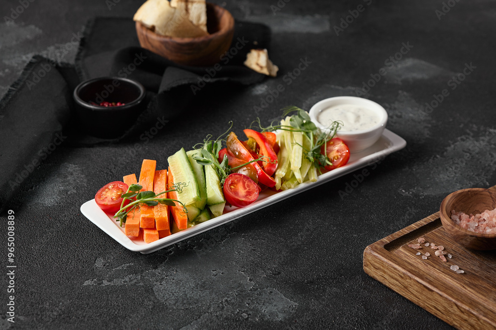 Vibrant Vegetable Plate with Dip on Rustic Black Background Fresh, Healthy, Colorful Cuisine
