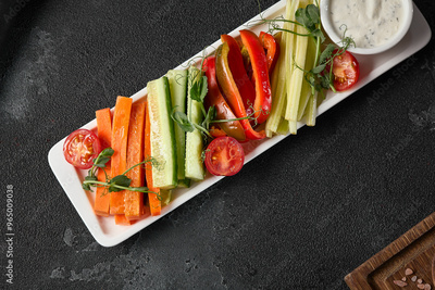 Vibrant Vegetable Platter Fresh and Healthy Assortment with Dip on Textured Black Background