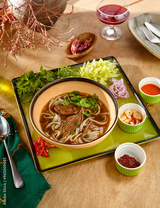 Authentic Vietnamese Beef Pho Bo Soup with Fresh Herbs and Spices