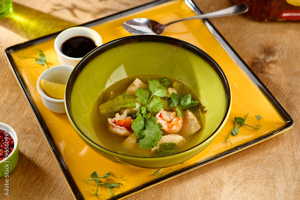 Fresh Shrimp Fish Soup With Cilantro and Vegetables on a Yellow Dish