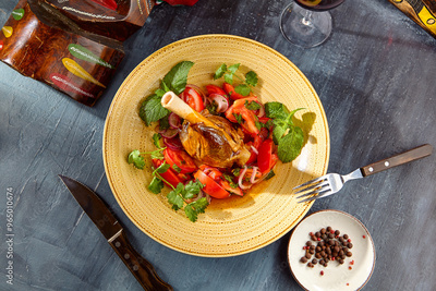 Gourmet Roasted Lamb Shank with Tomato Cilantro Salad - Rustic Culinary Photography