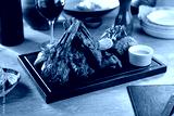 Gourmet Roasted Venison Rack with Vegetables on Black Tray - Rustic Fine Dining Presentation