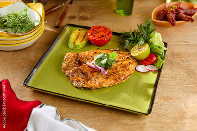 Gourmet Grilled Fish Dish with Fresh Vegetables on Rustic Wooden Table