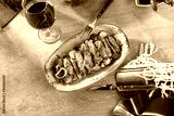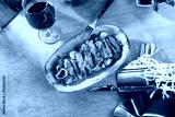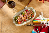 Gourmet Steak Salad with Red Wine on Rustic Table - Top View, Vibrant Colors, Elegantly Plated