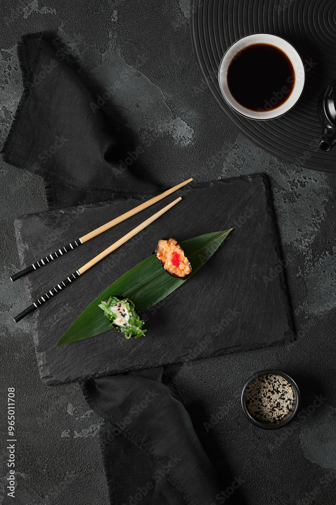 Elegant Food Photography of Gunkan Sushi with Chukka and Salmon on a Slate Plate
