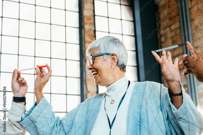 Senior businesswoman in professional setting shares a joyful moment while collaborating with colleagues in a modern office environment