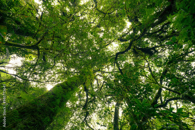 Looking up view of tree trunk to green leaves of tree in forest with sun light. Fresh environment in green woods. Forest tree on sunny day. Natural carbon capture. Sustainable conservation and ecology