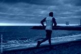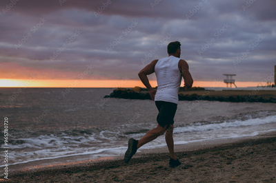 Back rear view young strong sporty athletic toned fit sportsman man wear sports clothes run jogging warm up training at sunrise sun dawn over sea sand beach outdoor on seaside in summer day morning.